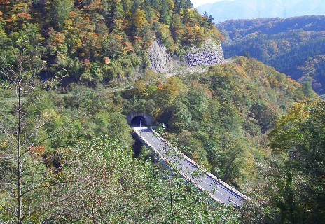のうちの1本。 秋田側から来た場合、最後のトンネルとなる。 写真は旧道から撮ったもので、坑口の真上にも旧道が通っている。
